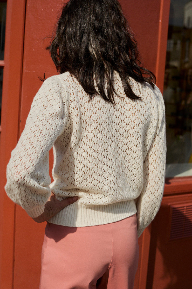 Knitted fitted cut with ribbed hem and sleeves. Round crew neck and long sleeves.