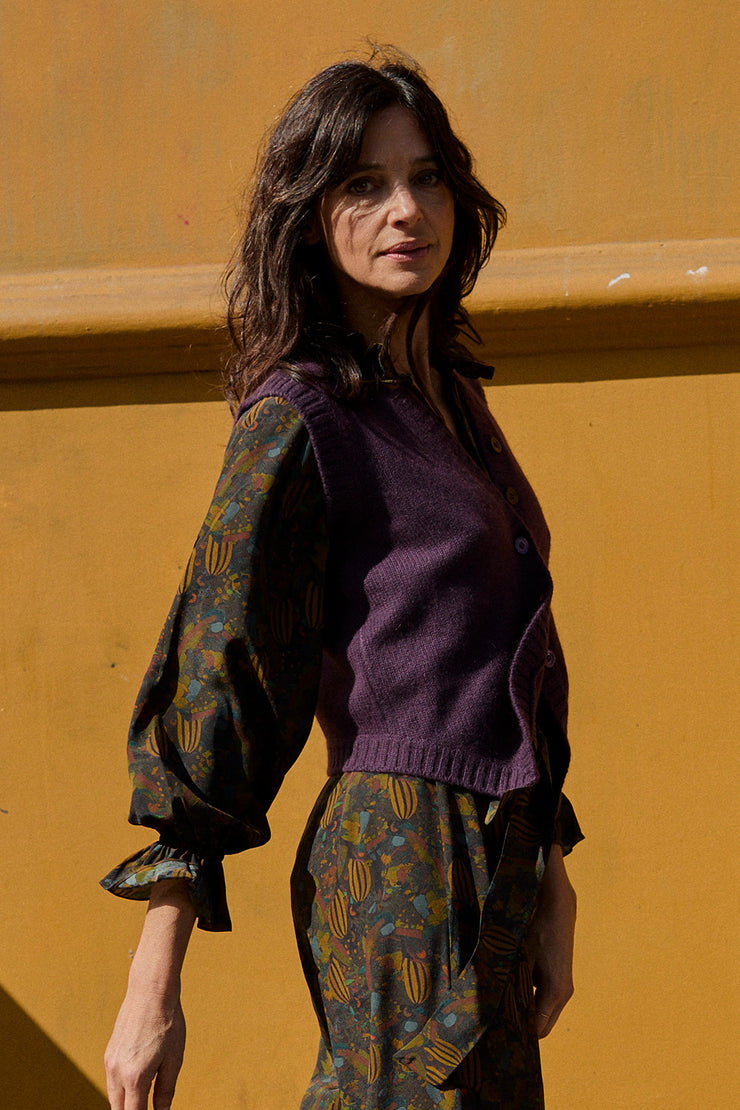 Peasant-style top. Frilly elasticized, gathered neckline with a hook and eye to be able to open and close. Long raglan sleeve with elastic frilly cuffs. Matching sash belt. Slips on with a relaxed fit. Unlined with French seams.