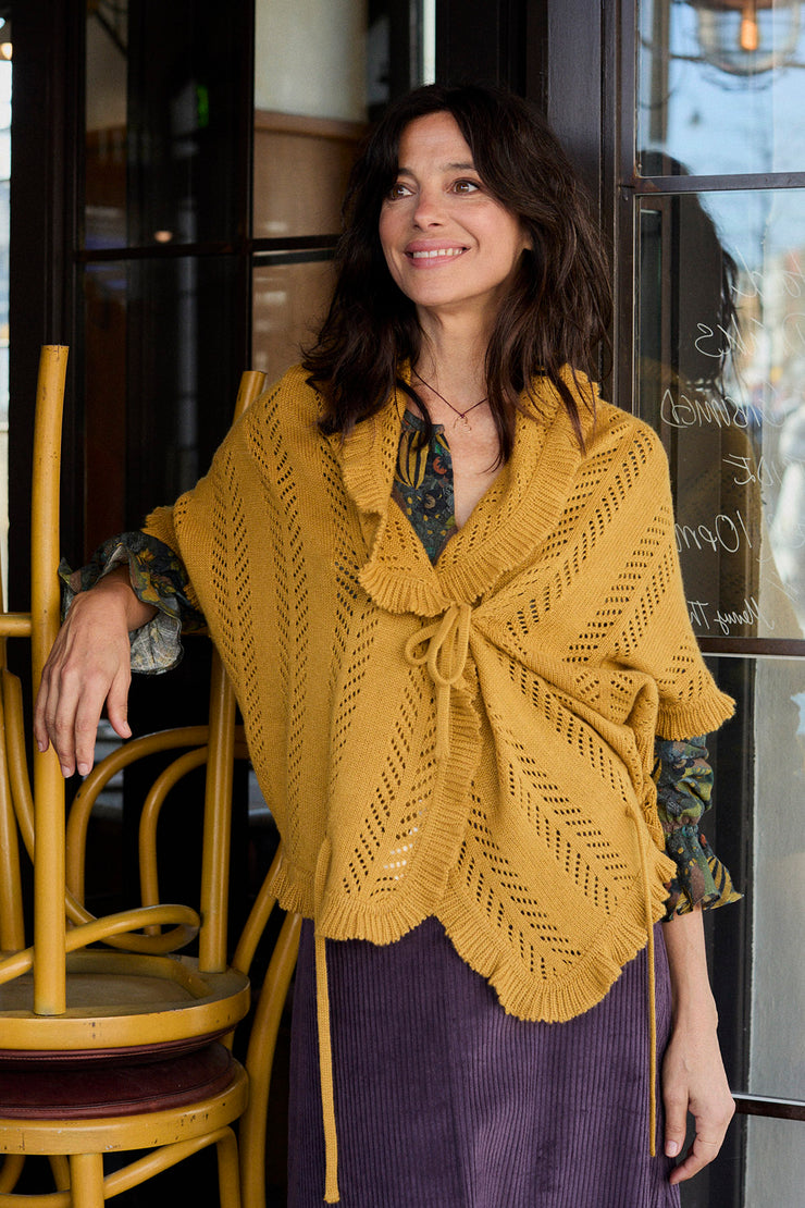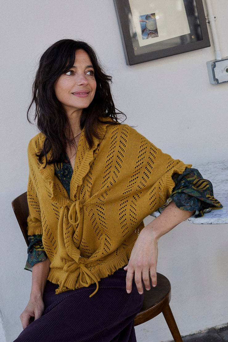 Openwork detailing and soft frilled edges. Fastened with ties, it can be worn loose, wrapped, or knotted.
