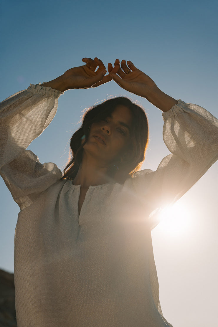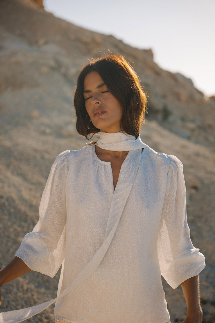 Round neck top with a slit. Gathered long sleeves with an elasticized cuff. Lined with French seams. With matching sash belt.