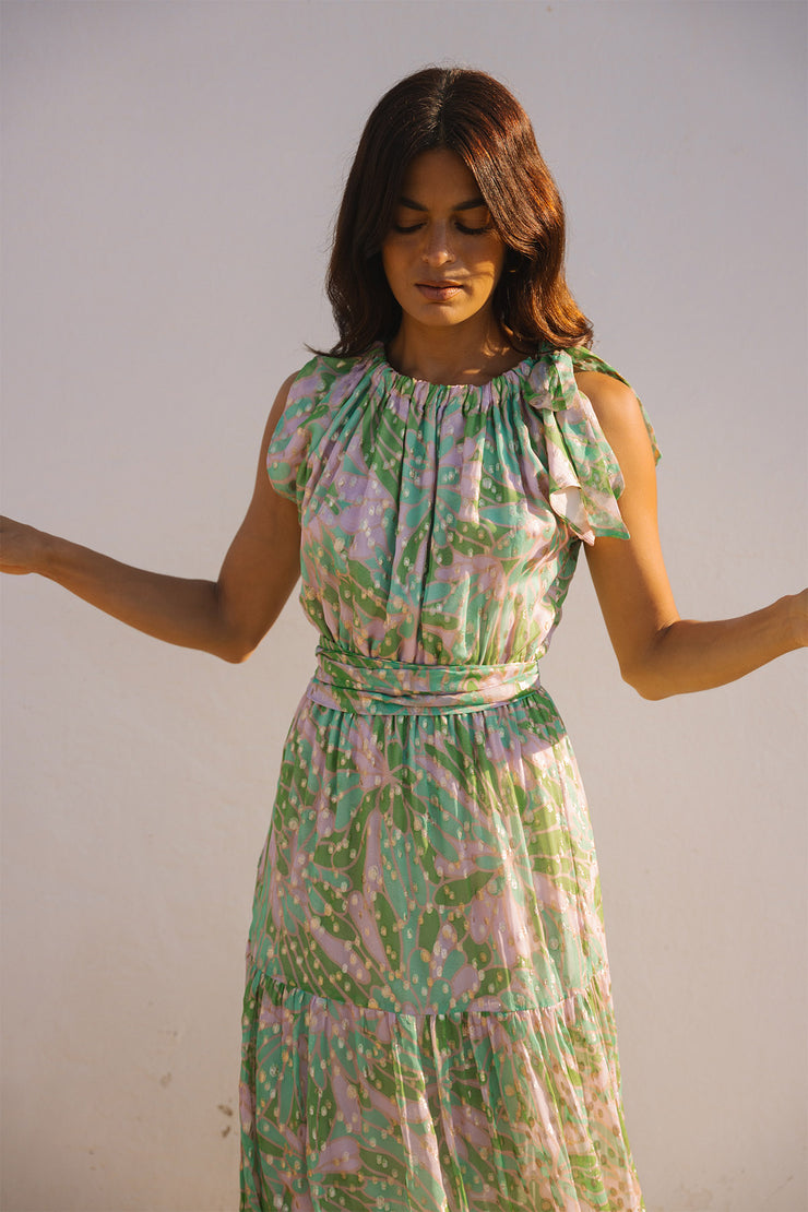 Elasticated round neck with side tie and pretty open sleeve. Gathered tiered maxi skirt with elasticated waist. Unlined with French seams. Matching sash belt