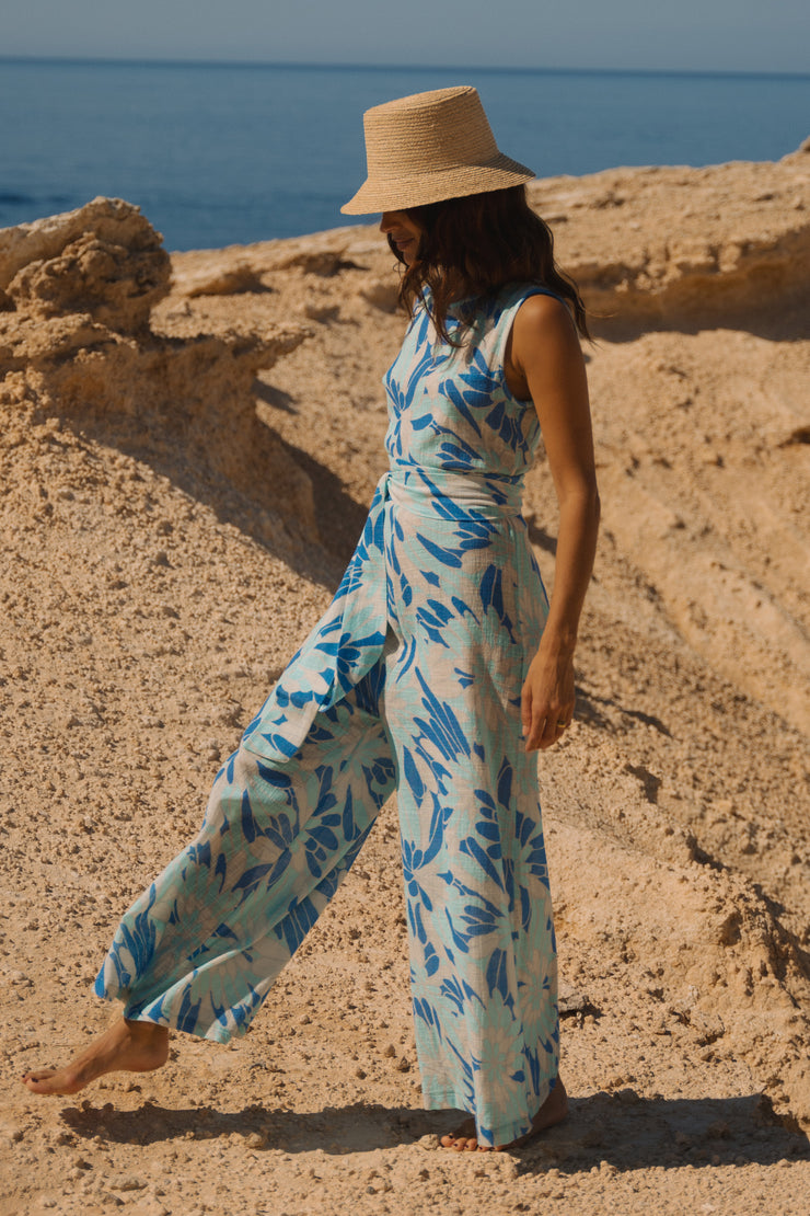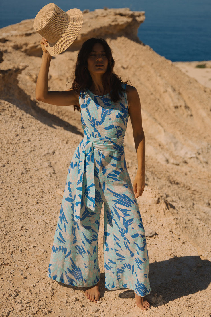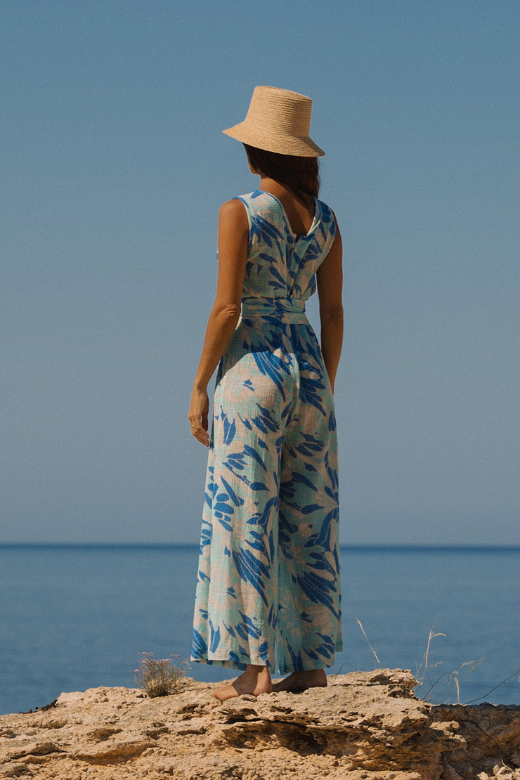 Round neck with closed back jumpsuit. Finished with hand-stitched binding. High-cut waist - matching sash belt included. Relaxed fit Palazzo trousers. Unlined with French seams.