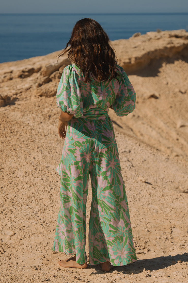 Round neck with closed back jumpsuit and puffy short sleeves. Finished with hand-stitched binding. High-cut waist - matching sash belt included. Relaxed fit Palazzo trousers. Unlined with French seams.