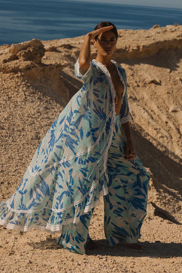 Open front with a string for closure, lace trim runs along the entire front opening, sleeve hems, and layered flounce lines. Full-cut back panel with flowing drape and extended length. Loose, voluminous fit with wide panels. Unlined with French seams.