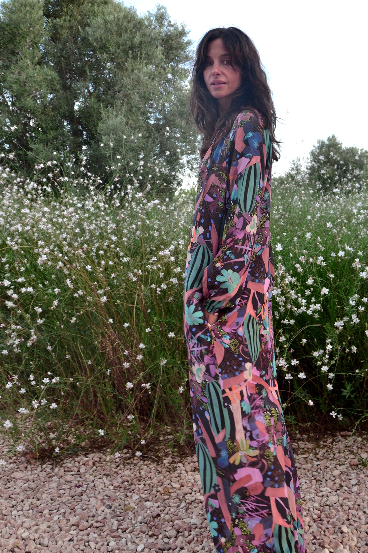 Loose top with long sleeves and a keyhole tie front falling into a straight maxi dress. Slips on, unlined with French seams