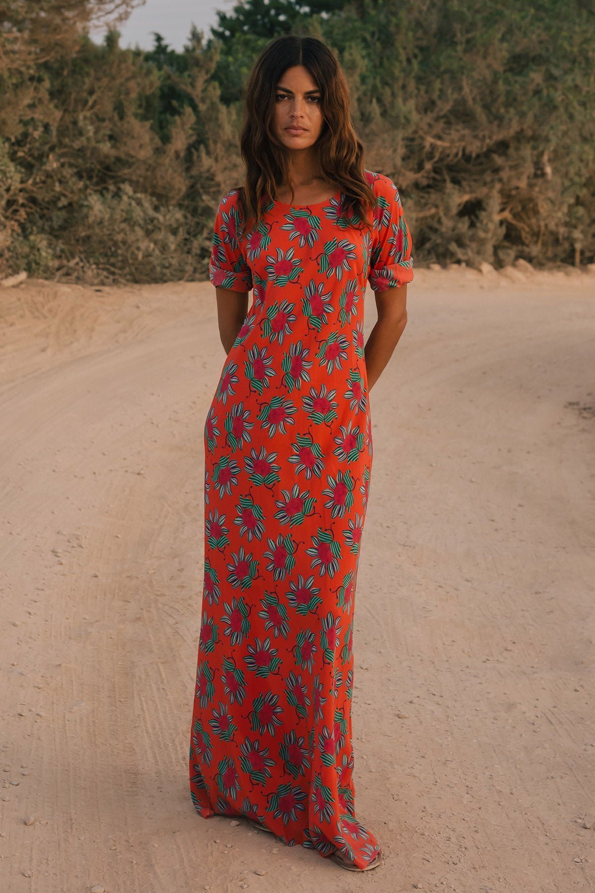 Full-length, bias-cut dress with round neckline, long fitted sleeves, and a seamless silhouette. Unlined with French seams.