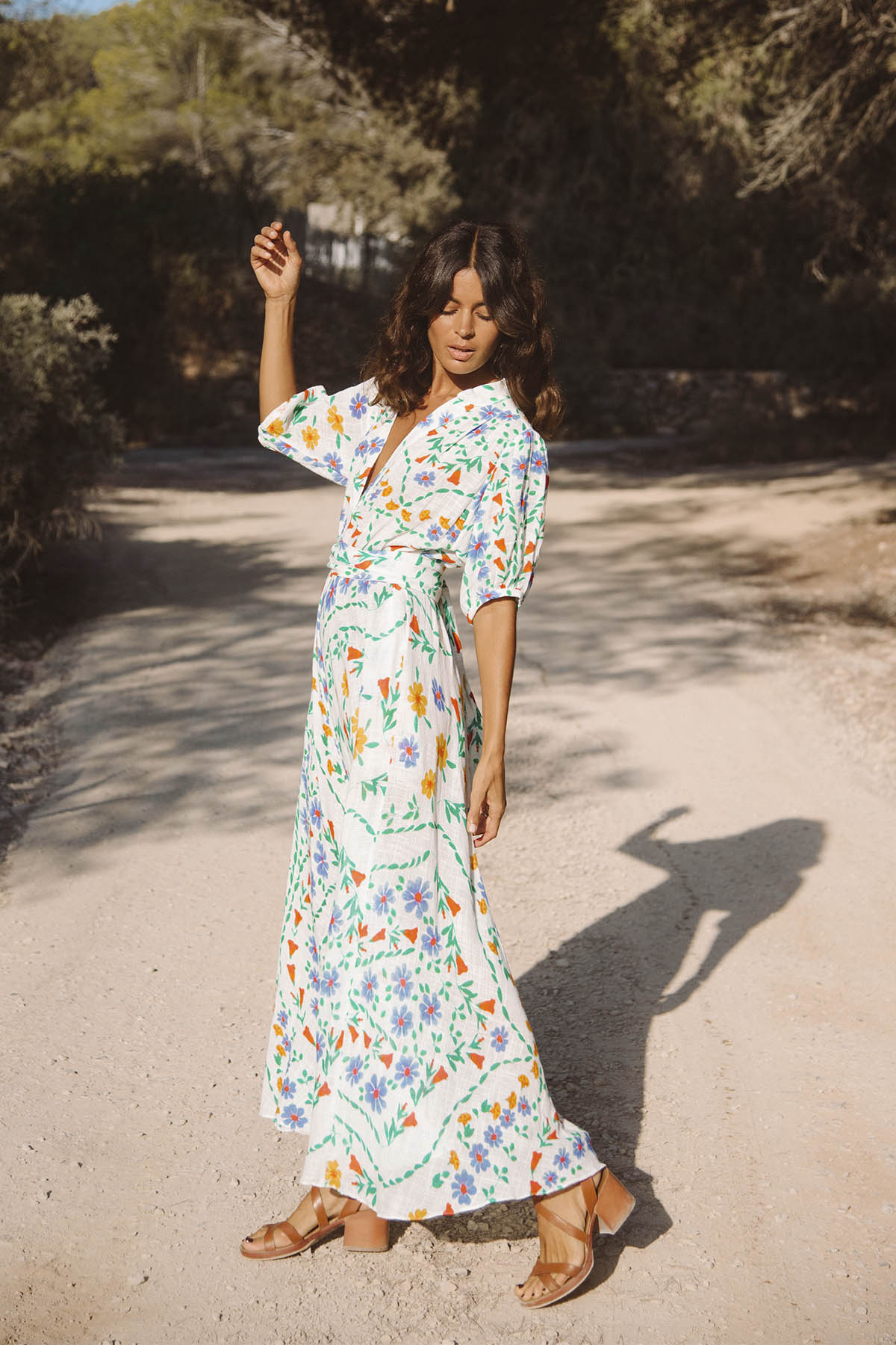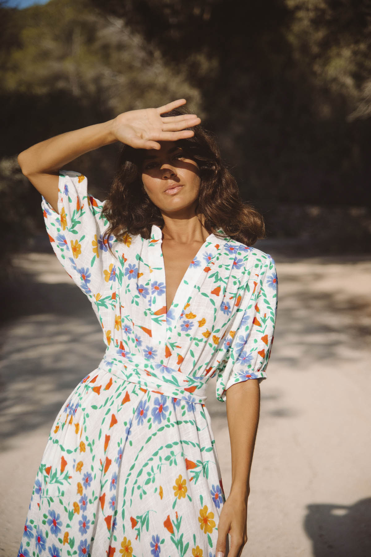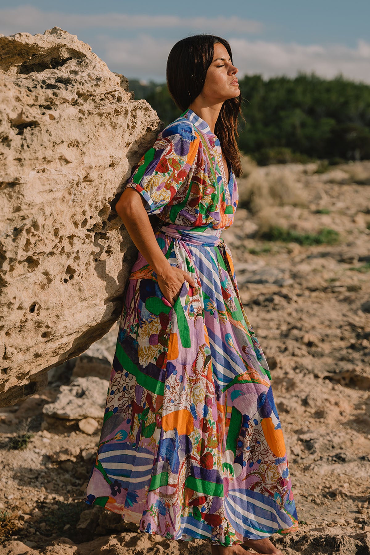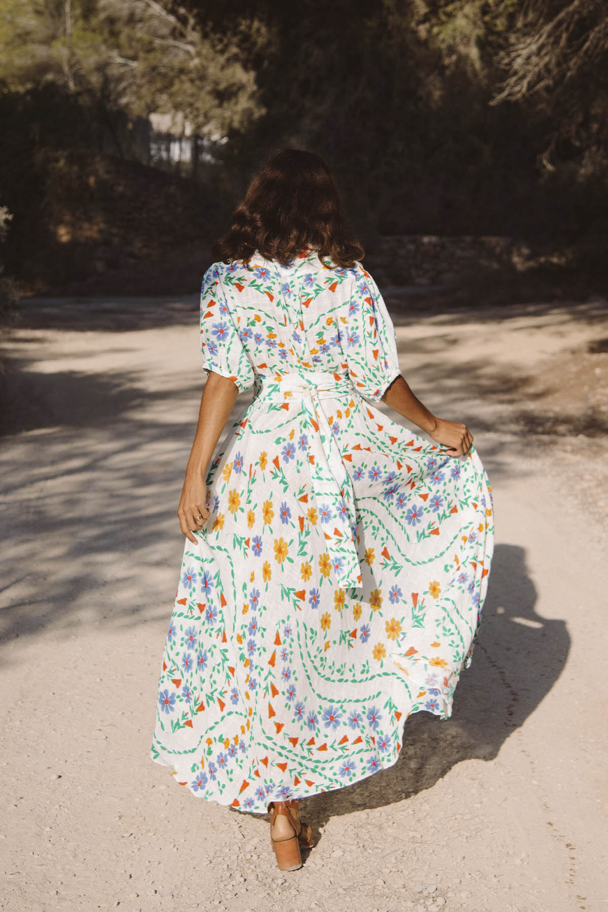 Semi-circle ankle-length skirt dress with an open front button-round neck. Three-quarter puffy sleeve. Loose fit. Unlined with French seams. Matching sash belt